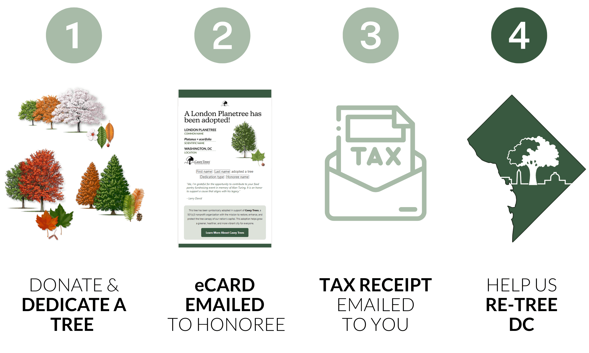 Symbolically adopt a Yoshino Cherry, London Planetree, Dawn Redwood, or Red Maple and help re-tree Washington, DC.